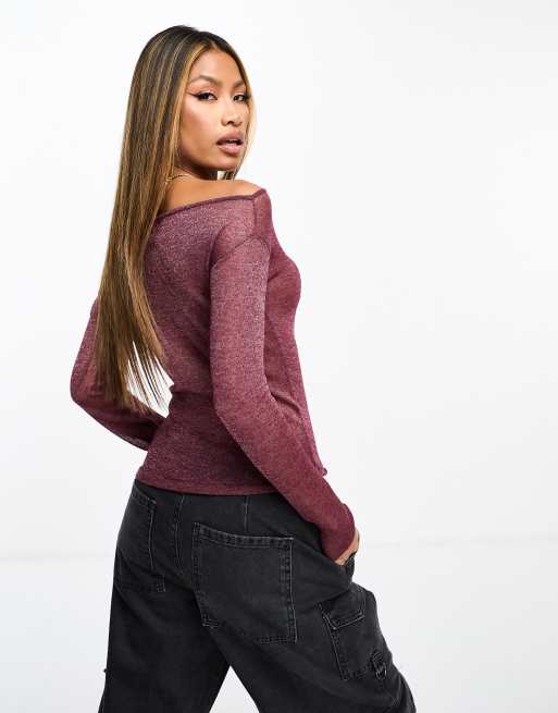 ASOS DESIGN sheer knitted off shoulder top in burgundy Very well made.
