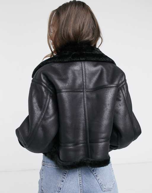 ASOS DESIGN cropped borg aviator jacket in black Very well made.