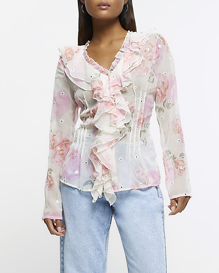 Pink chiffon floral frill blouse River Island Very well made.