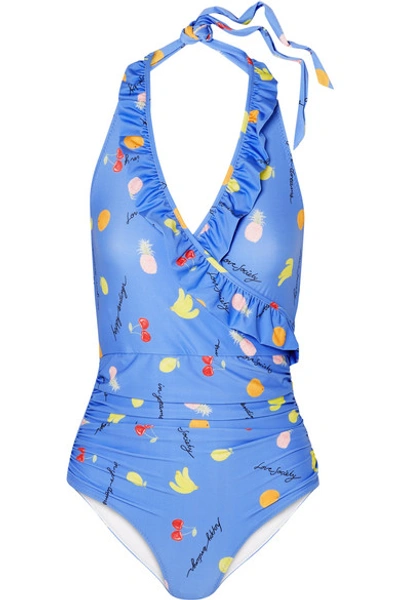 Ganni Dexies Ruffled Printed Halterneck Swimsuit In Light Blue ModeSens Very well made.