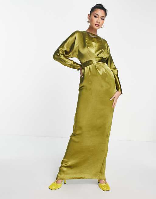 ASOS DESIGN maxi dress with batwing sleeve and wrap waist in satin in olive Very well made.