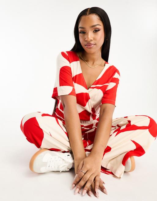 Monki tie waist jumpsuit in red puzzle print Very well made.