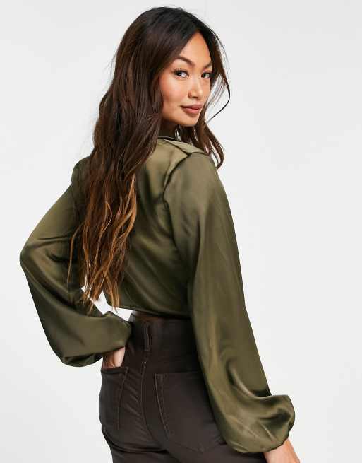 Flounce London satin tie front satin blouse in olive green Very well made.
