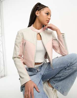 Stradivarius motocross Miami pink and white faux leather jacket ASOS Very well made.