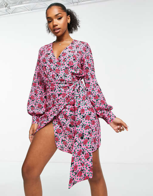Glamorous multi rose print wrap mini dress in pink Very well made.