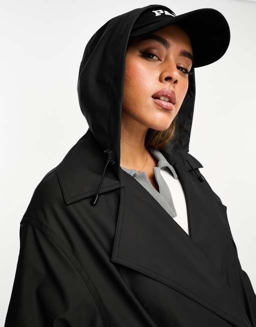 ASOS DESIGN oversized rubberized rain hooded trench with belt detail in black Very well made.