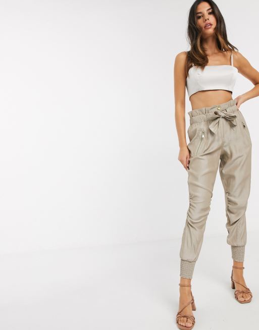 River Island ruched satin tie waist jogger pants in beige Very well made.