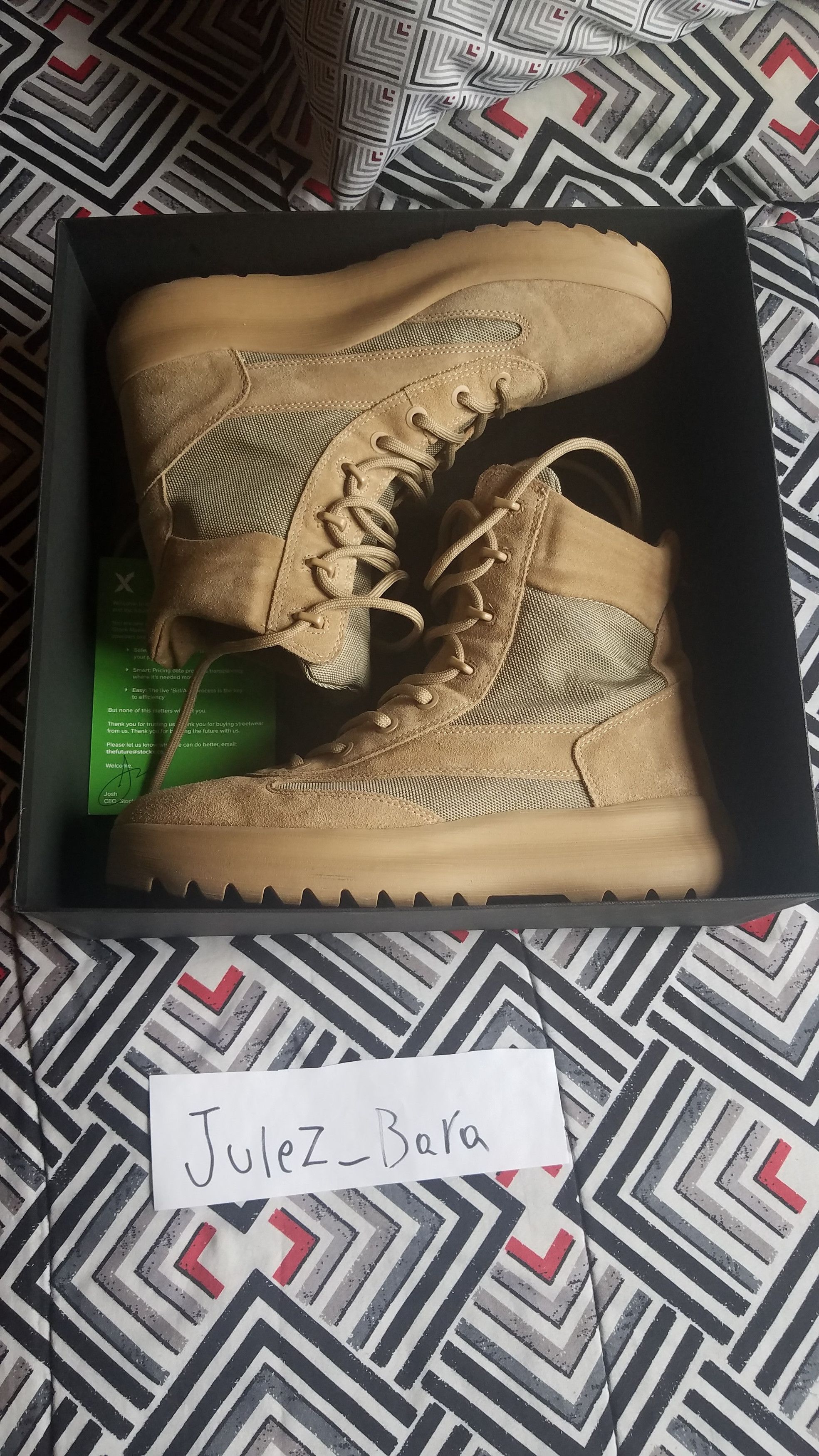The pair of Yeezy Canvas Boot Season 5 Taupe door Drake on his Very well made.