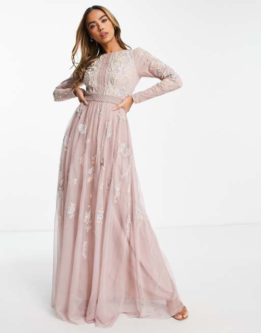 ASOS DESIGN Bridesmaid pearl embellished long sleeve maxi dress with floral embroidery in rose Very well made.