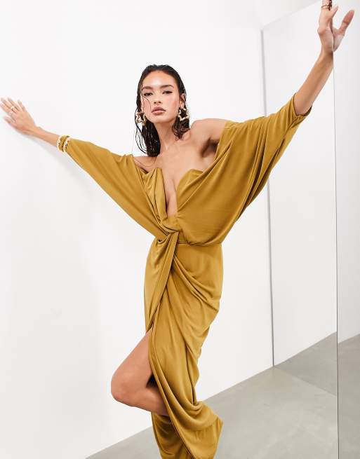 ASOS EDITION extreme plunge draped long sleeve maxi dress in ochre Very well made.