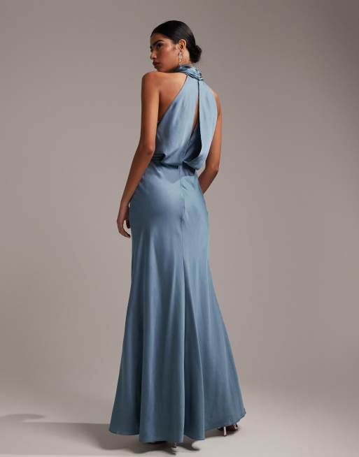 ASOS DESIGN Bridesmaid satin ruched halter neck maxi dress in dusky blue Very well made.