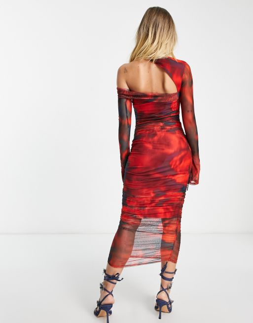 ASOS DESIGN asymmetric one sleeve mesh ruched midi dress in red smudge print Very well made.