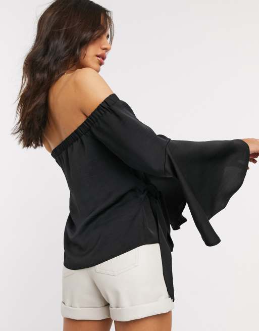 ASOS DESIGN off shoulder drape wrap top in satin in black Very well made.