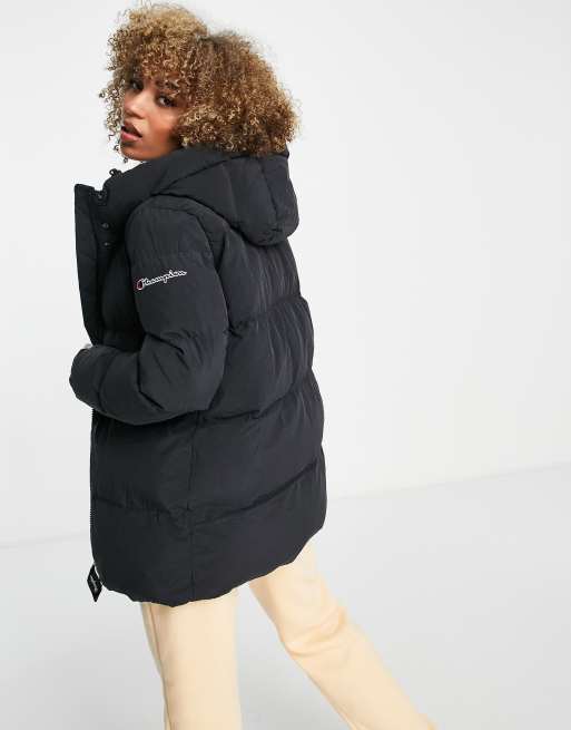 Champion small logo longline puffer jacket in black Very well made.
