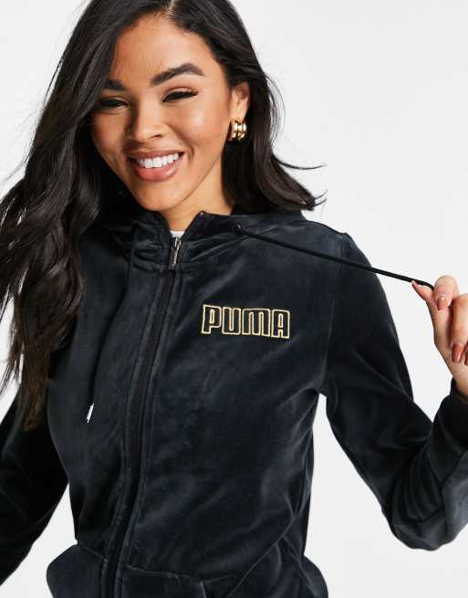 Puma Modern Basic Felpa con cappuccio e zip in velour nero e oro Very well made.