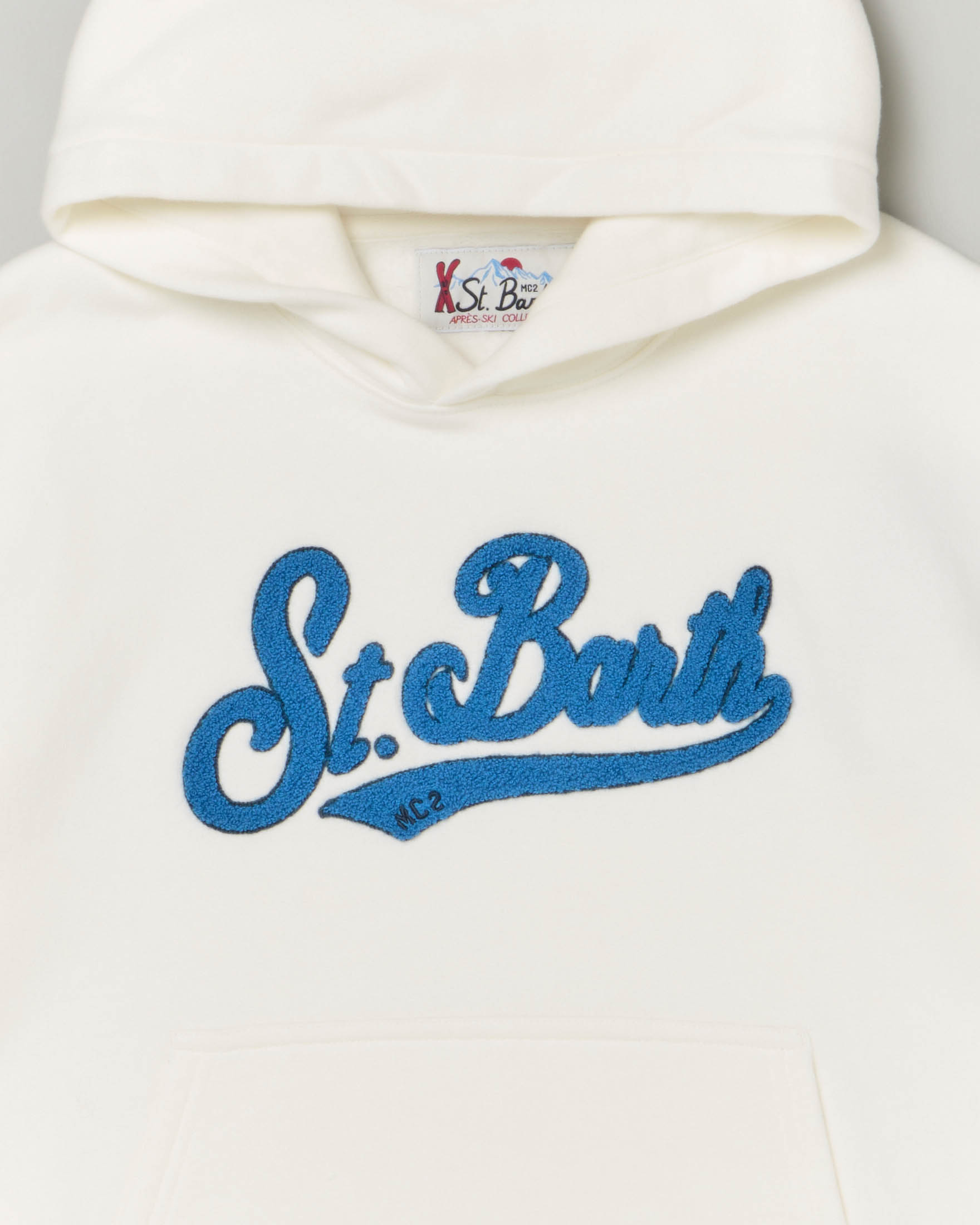 Felpa bianca in cotone con cappuccio e stampa logo azzurra in Very well made.
