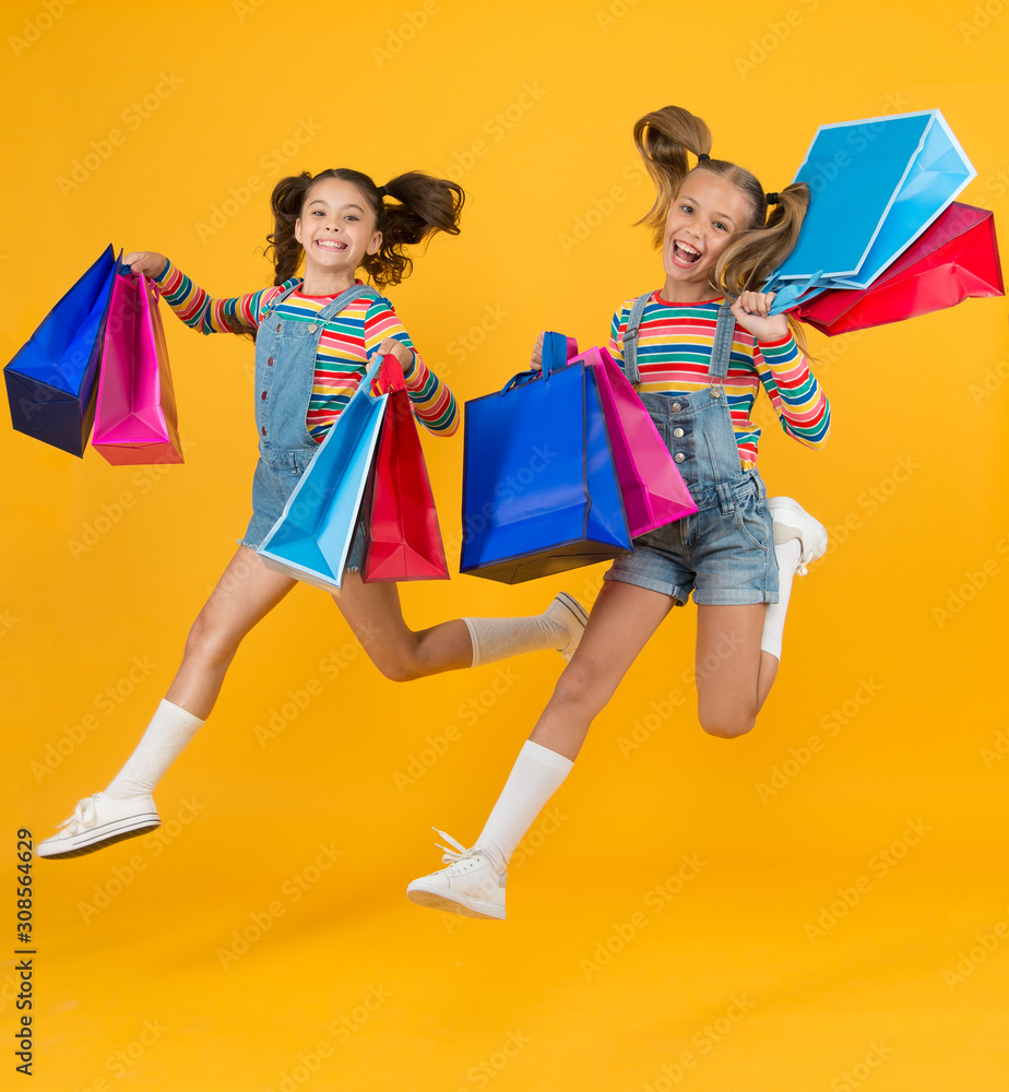 Happy children. Little girls with gifts. Summer shopping. Total Very well made.