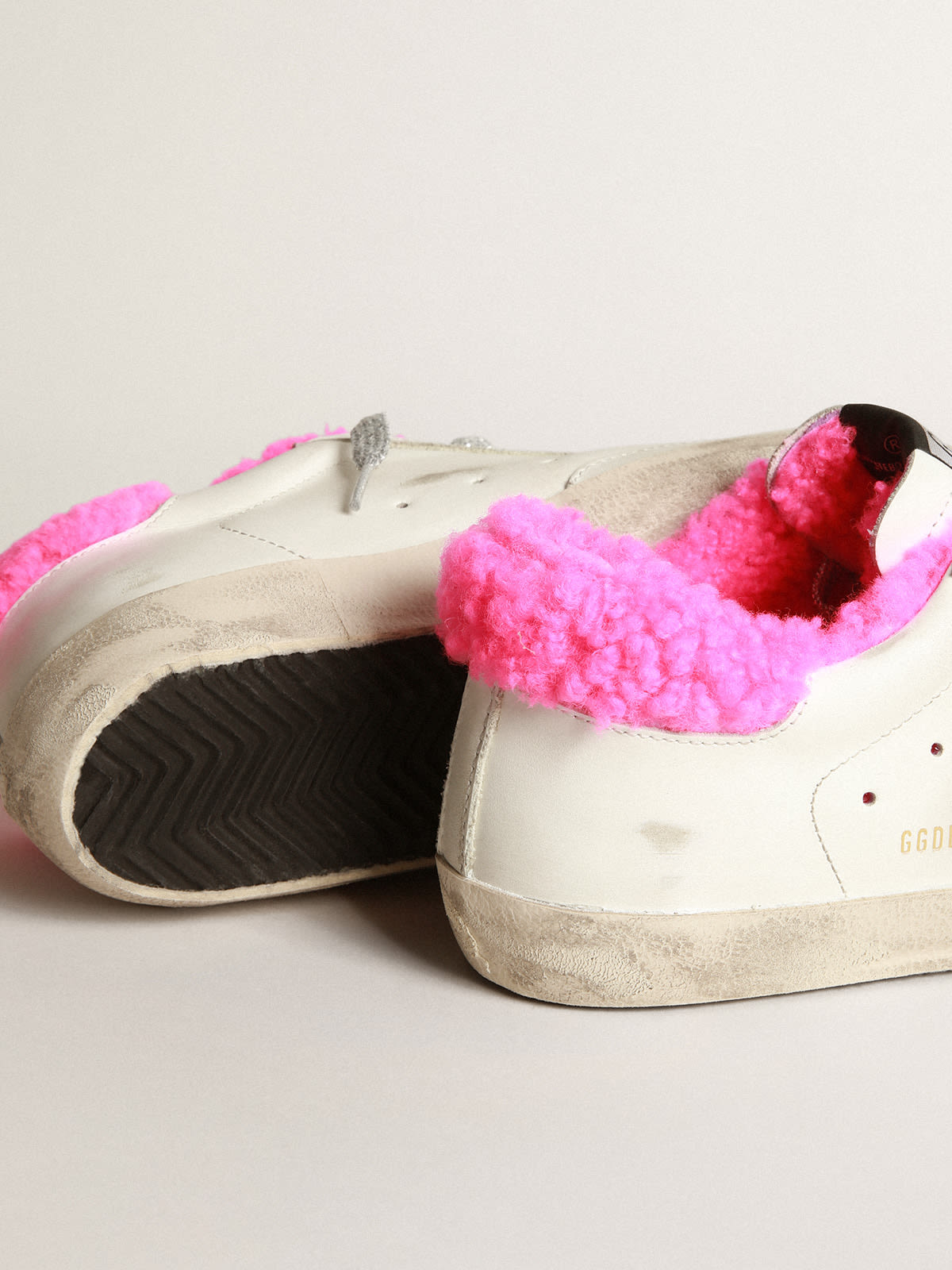 Super Star sneakers with fuchsia shearling lining and ice gray suede star Very well made.