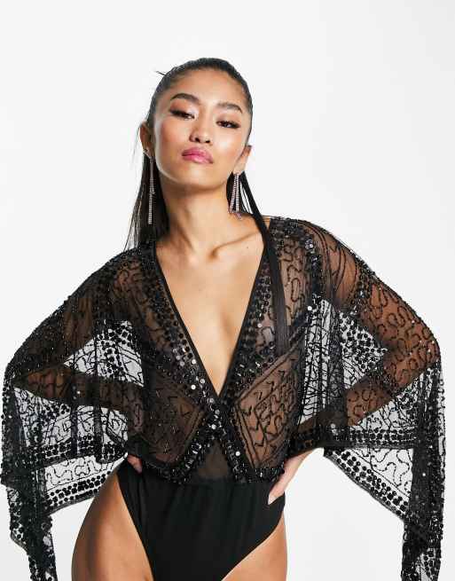 Frock and Frill premium embellished kimono sleeve bodysuit in black Very well made.