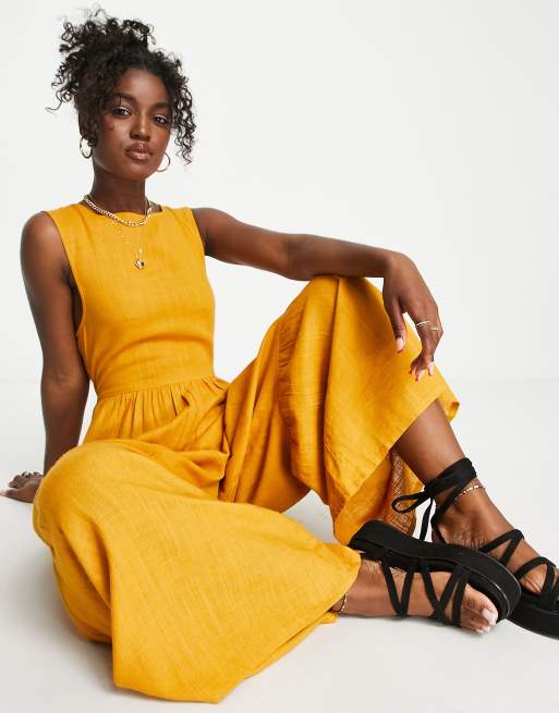 ASOS DESIGN linen smock tie back jumpsuit in mustard Very well made.