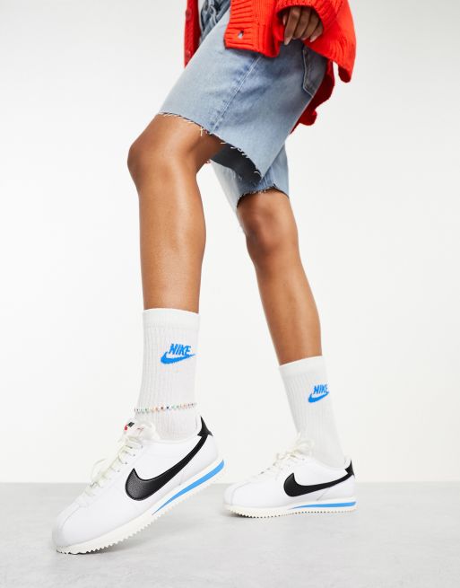 Zapatillas de deporte blancas negras y azules de cuero Cortez de Very well made.