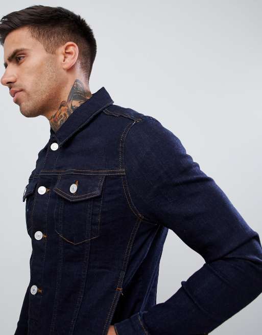 River Island muscle fit denim jacket in dark wash blue Very well made.