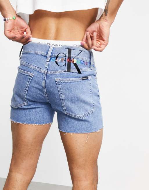 Calvin Klein Jeans Pride logo slim fit denim shorts in mid wash Very well made.