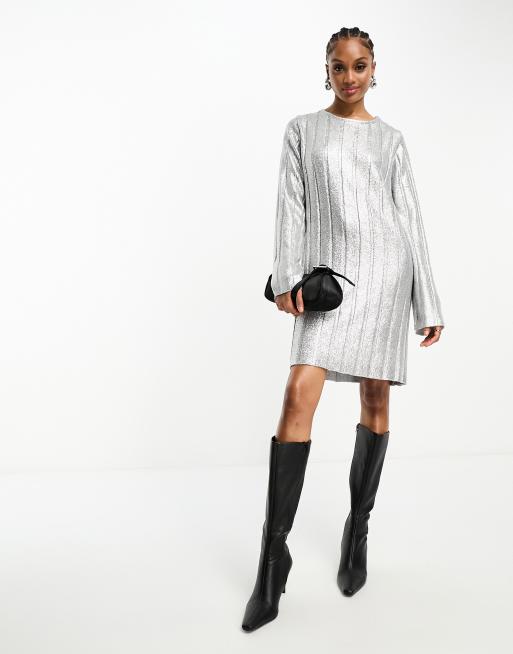 4th Reckless Tall exclusive metallic tie back mini sweater dress in silver Very well made.
