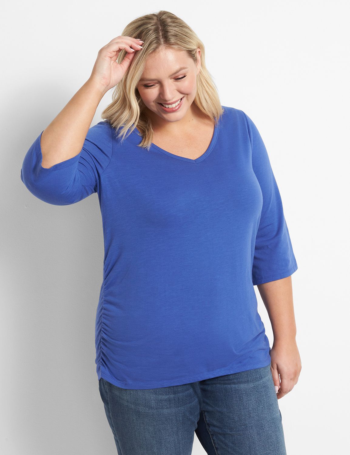 3 4 Sleeve V neck Side Ruched Tee 1123718 PANTONE Deep Ultramarine 22 24 Very well made.