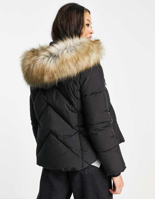 Topshop padded coat with faux fur hood in black Very well made.
