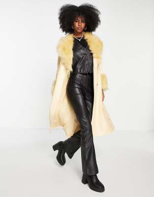 Topshop Pu And Faux Fur Trim Long Belted Coat In Buttermilk neutral ModeSens Very well made.