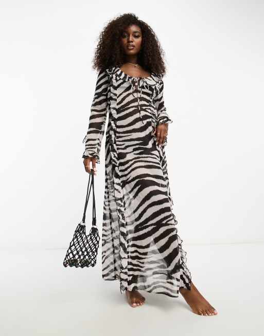 Miss Selfridge Vestito lungo a maniche lunghe da mare in chiffon zebrato con spacco laterale Very well made.