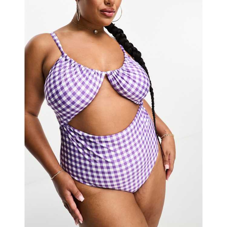 ASOS DESIGN Curve ruched cut out swimsuit in purple check print Very well made.