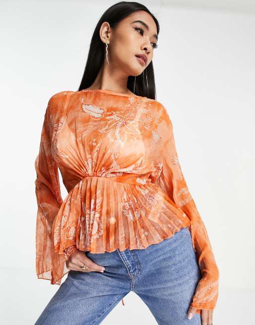 ASOS DESIGN pleated long sleeve blouse with twist front in orange Very well made.