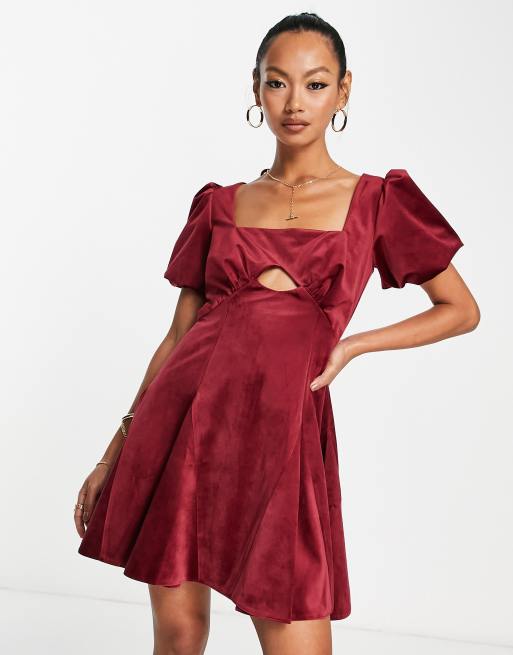 ASOS DESIGN puff sleeve velvet mini dress with godet detail in burgundy Very well made.