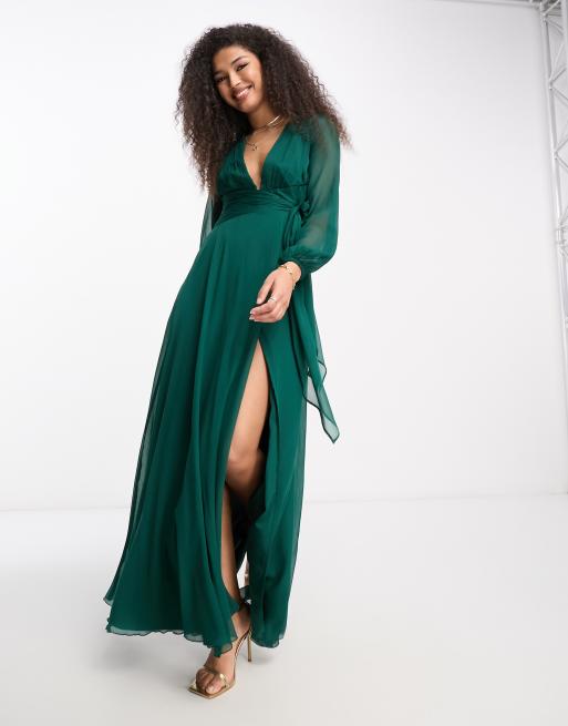 ASOS DESIGN Bridesmaid long sleeve ruched maxi dress with wrap skirt in forest green Very well made.