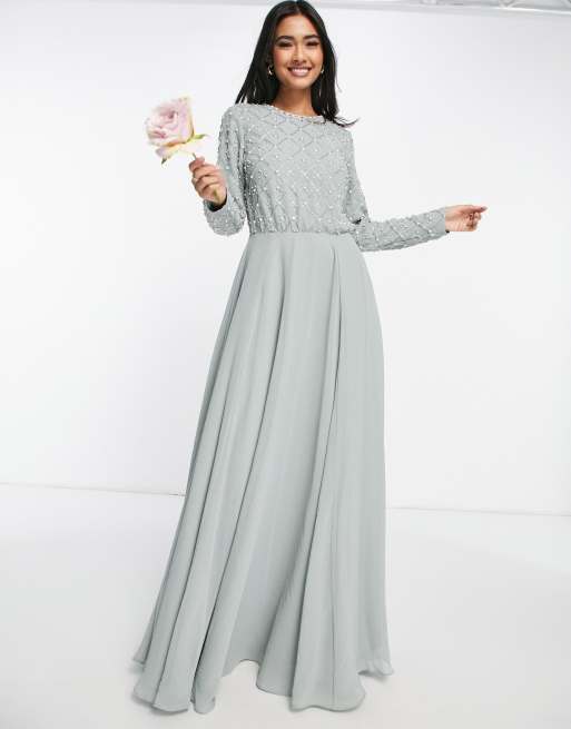 ASOS DESIGN Bridesmaid maxi dress with long sleeve in embellishment in olive Very well made.
