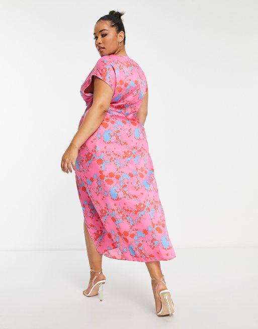 ASOS DESIGN Curve ruched side button cap sleeve satin maxi dress in pink based floral print Very well made.