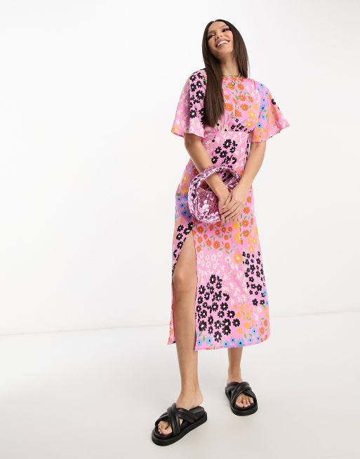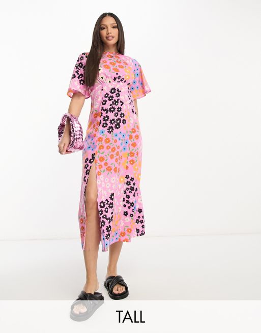 Influence Tall flutter sleeve midi tea dress in pink floral print Very well made.