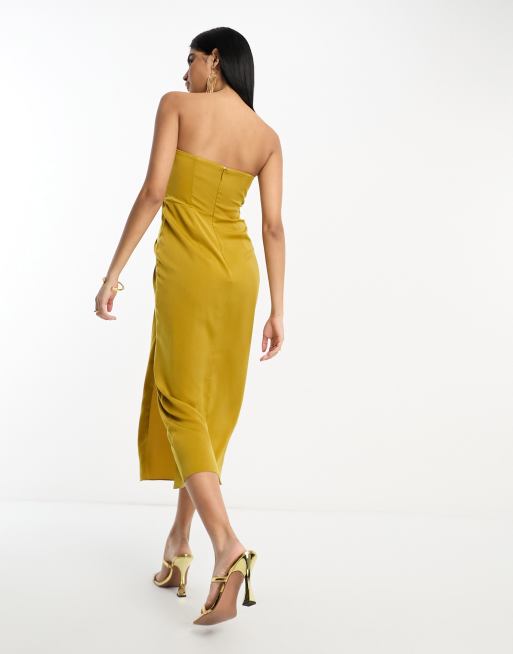 ASOS DESIGN satin bandeau twist front midi dress in gold Very well made.