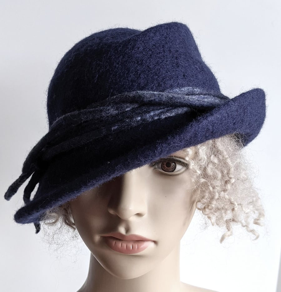 Navy asymmetrical felted wool hat Very well made.