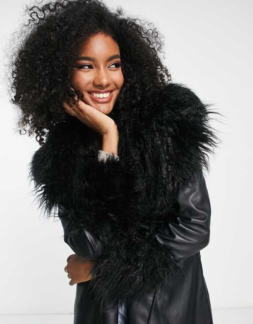 Vila faux fur trim leather look coat with belt in black ASOS Very well made.