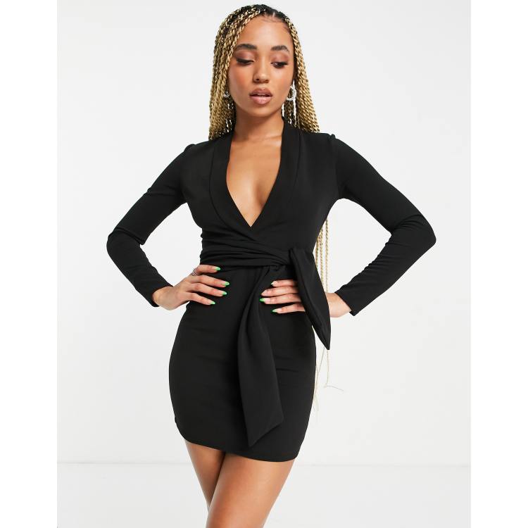 ASOS DESIGN long sleeve v neck mini dress with tie belt in black Very well made.